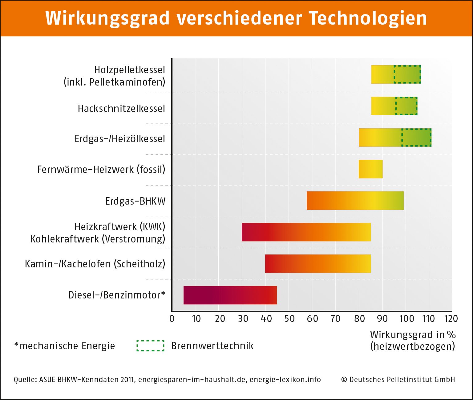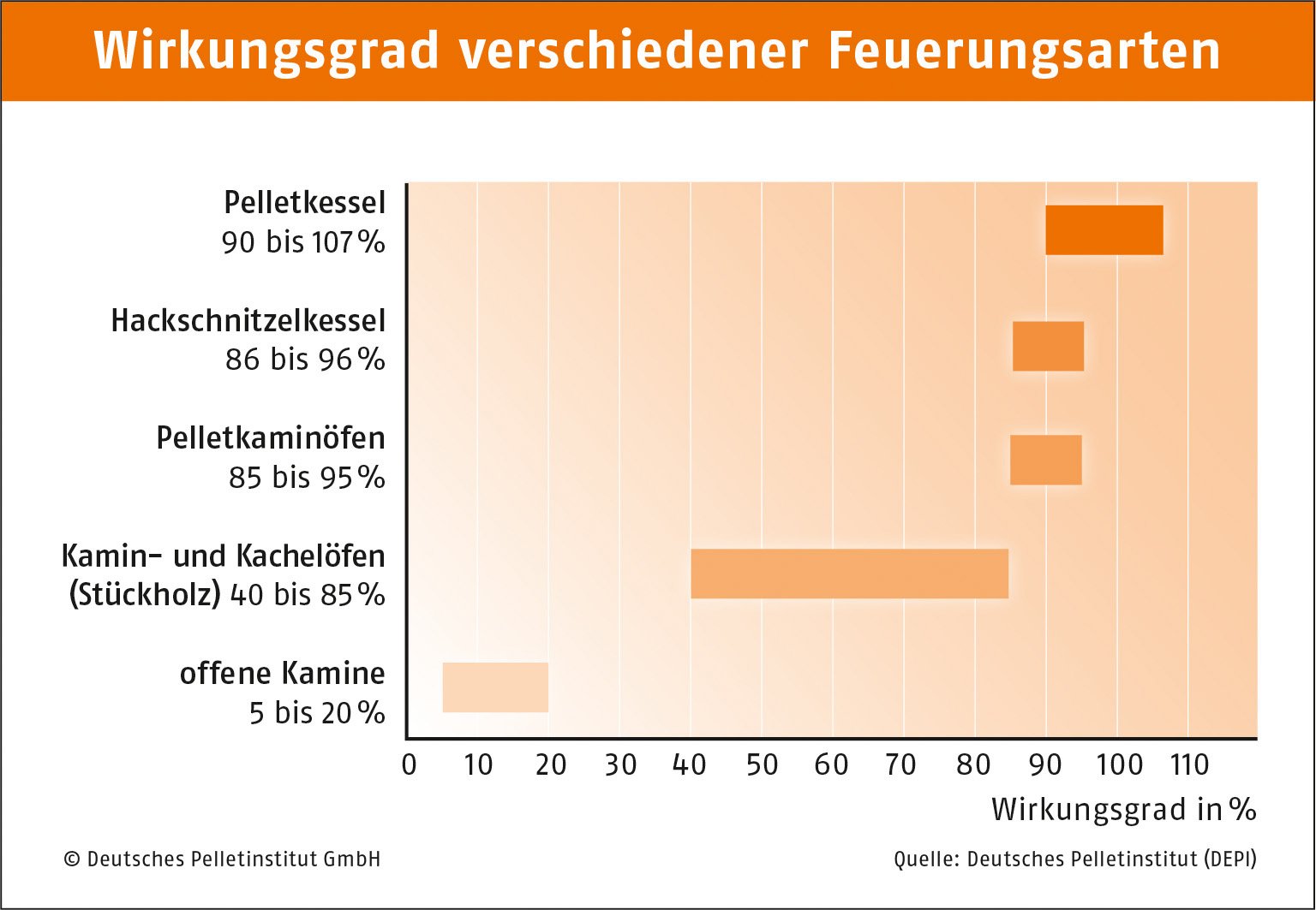 Der Wirkungsgrad gibt an, wie viel der im Brennstoff vorhandenen Energie in nutzbare Wärme umgewandelt werden kann, wobei zu unterscheiden ist, ob sich der Wirkungsgrad auf den Heizwert oder den Brennwert bezieht. Bei Holzpelletkesseln liegt der heizwertbezogene Wirkungsgrad zwischen 90 und 95 Prozent, bei Brennwertkesseln über 100 Prozent. Diese Wirkungsgrade liegen etwas über denen von Hackschnitzelkesseln und Pelletkaminöfen, aber deutlich über denen von mit Stückholz betreibenen Kamin- oder Kachelöfen und offenen Kaminen.