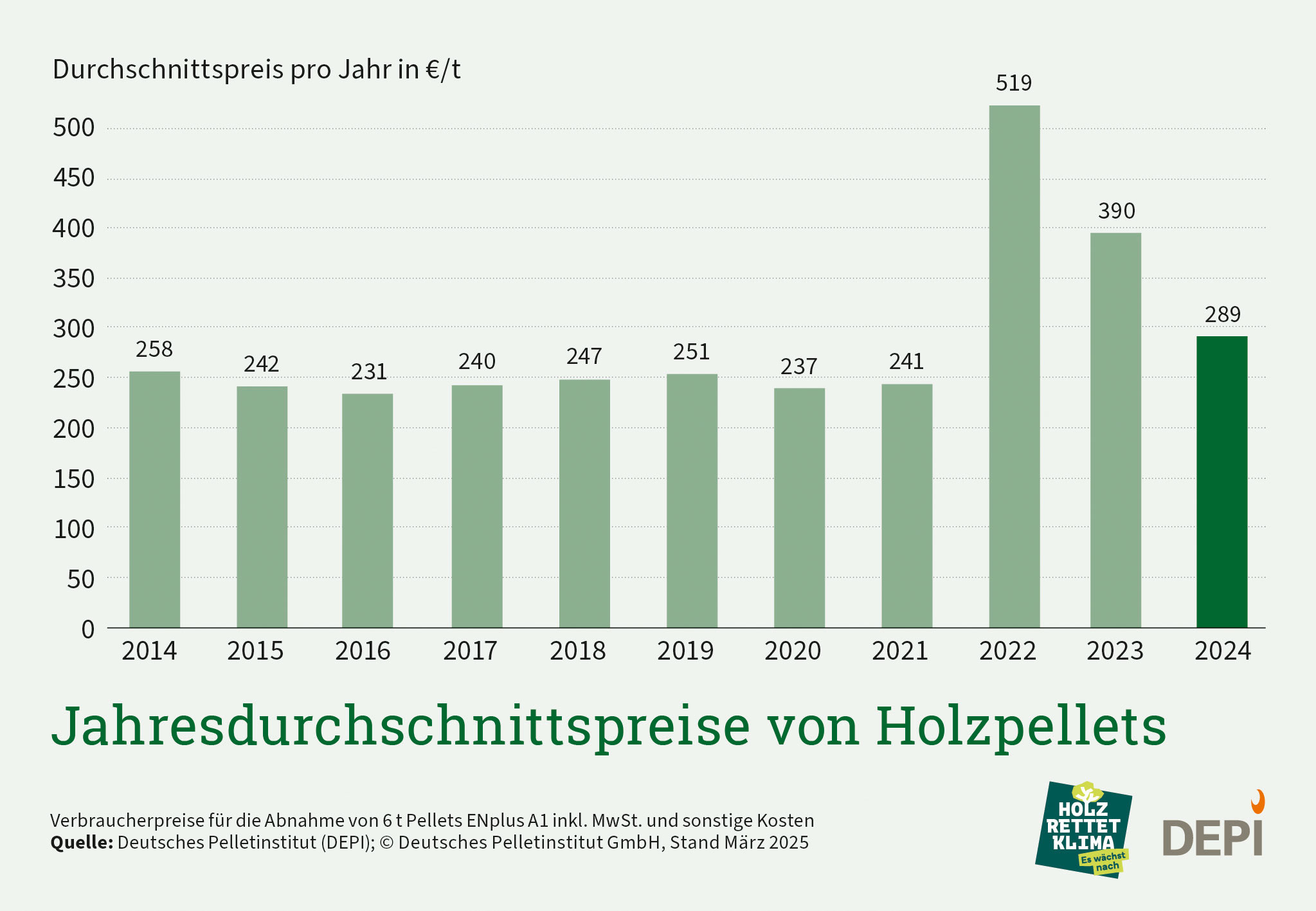 Der Pelletpreis für Deutschland wird vom Deutschen Pelletinstitut (DEPI) erhoben. Am 15. jedes Monats endet der Erhebungszeitraum. Der Pelletpreis wird seit 2011 im Monatsrhythmus veröffentlicht – bis Oktober 2020 vom DEPV, seit November 2020 als DEPI-Pelletpreis für verschiedene Abnahmemengen und Regionen. Er entspricht dem Durchschnittspreis in Deutschland für eine Tonne (t) Pellets der Qualitätsklasse ENplus A1 (lose, Lieferung im Umkreis von 50 km, inkl. aller Nebenkosten und MwSt., derzeit 7 Prozent).