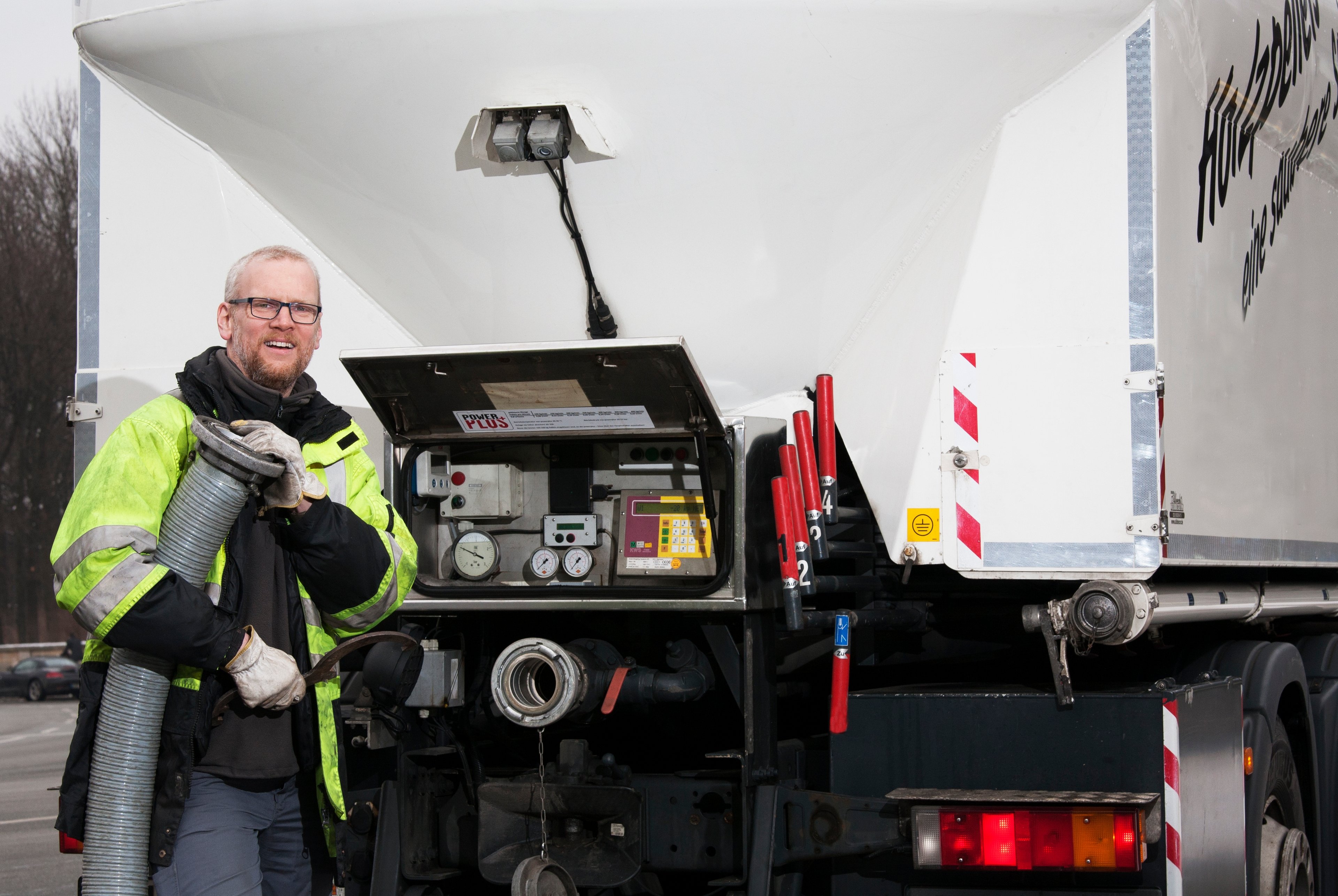 Den Einblasvorgang der Holzpellets ins Lager steuert der Fahrer über seinen LKW.