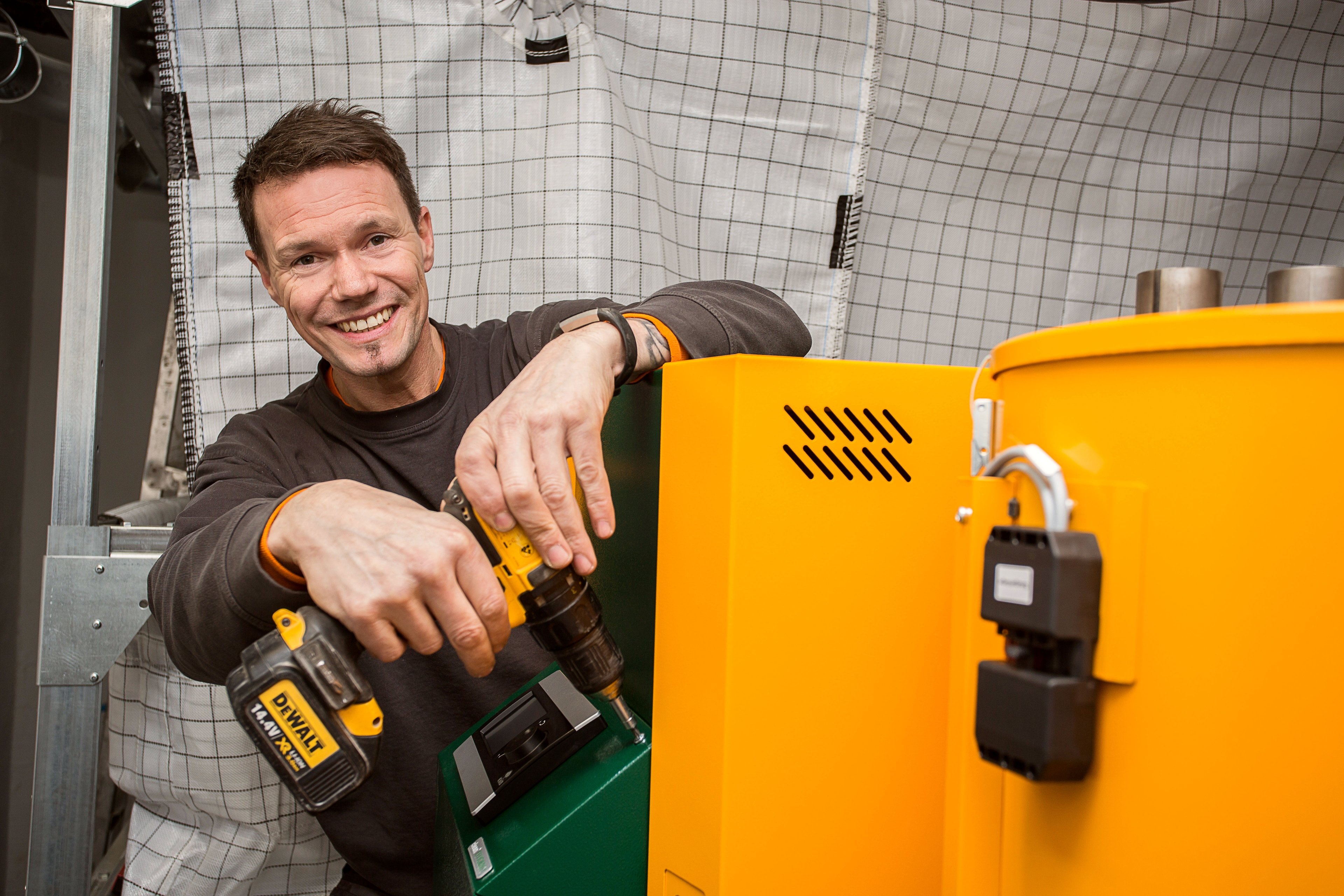 Heizungsbauer beim Einbau einer Pelletheizung