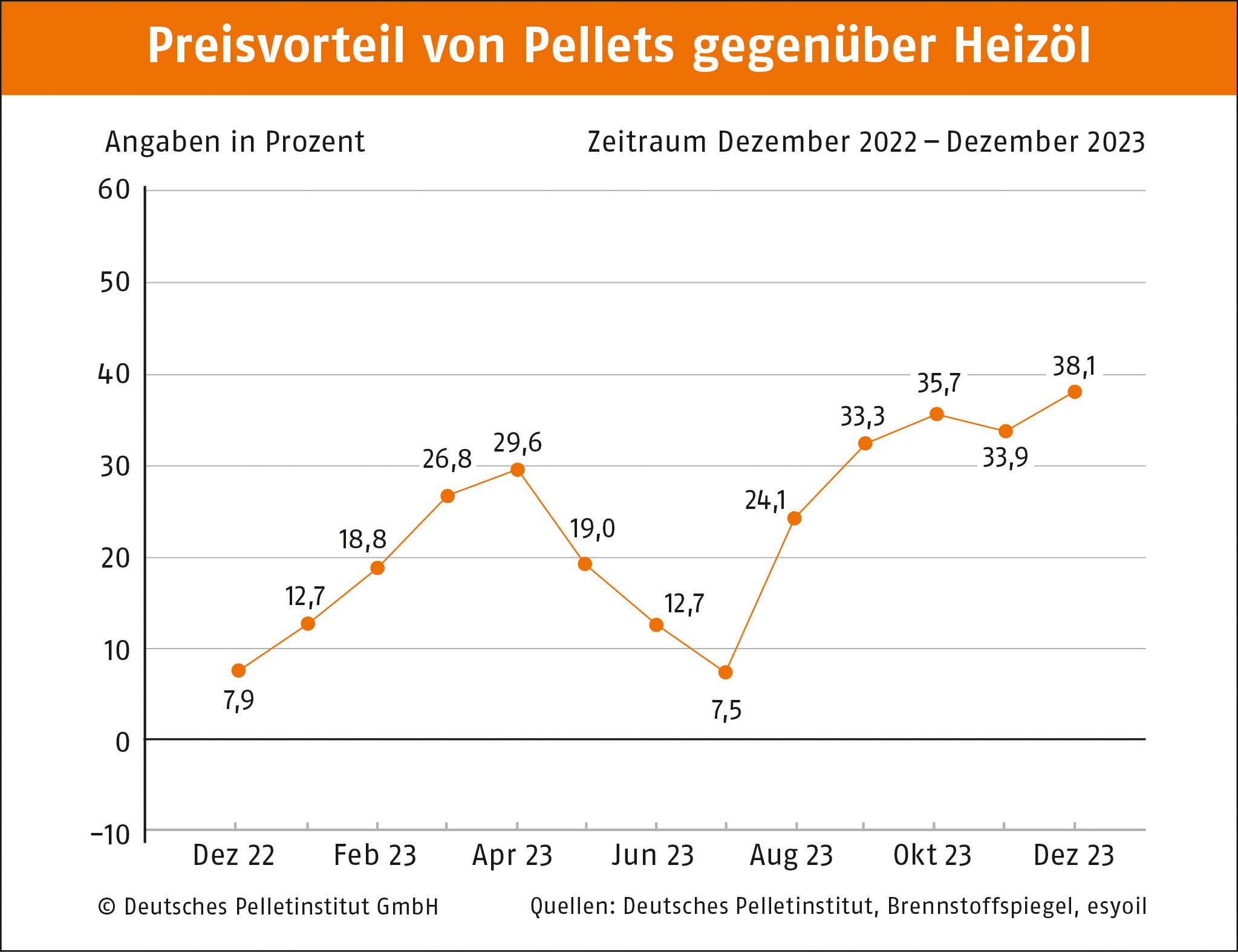 Berlin, 18.12.2023 • Bei gestiegenen Temperaturen Mitte Dezember ist der Preis für Holzpellets erneut gesunken. Laut dem Deutschen Pelletinstitut (DEPI) kostet eine Tonne (t) des Brennstoffs derzeit im Durchschnitt 329,25 Euro. Im Vergleich zum Vormonat ist das ein Rückgang um etwa 6,2 Prozent. Pro Kilowattstunde Wärme aus Pellets zahlen Pelletheizer aktuell 6,59 Cent. Der Preisvorteil zu Heizöl von rund 38 Prozent und zu Erdgas von rd. 34,8 Prozent bleibt auf stabil hohem Niveau. Von der anstehenden Verteuerung der CO2-Preise für fossile Brennstoffe sind Holzpellets auch künftig nicht betroffen.