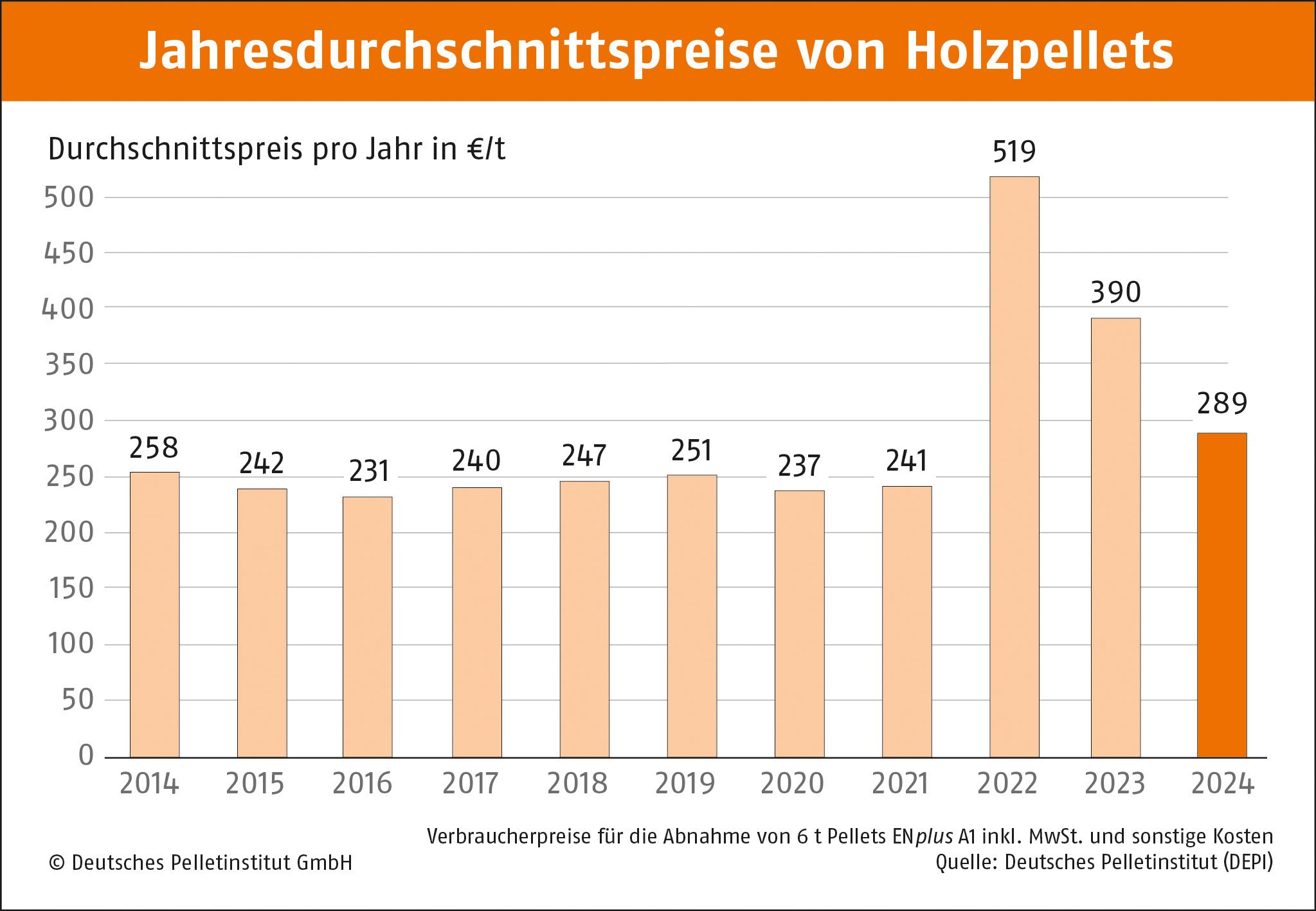 Seit 2011 wird der DEPI-Pelletpreis monatlich veröffentlicht, bis Dezember 2020 vom Deutschen Energieholz- und Pellet-Verband (DEPV). Er gibt den Durchschnittspreis in Deutschland für eine Tonne Pellets der Qualitätsklasse ENplus A1 für die jeweilige Abnahmemenge wieder (Lieferung im Umkreis von 50 km, inklusive aller Nebenkosten und Mehrwertsteuer) – deutschlandweit und in drei Regionen. Der DEPV bietet einen separaten DEPV-Pelletpreis für Netto-Lieferverträge an.