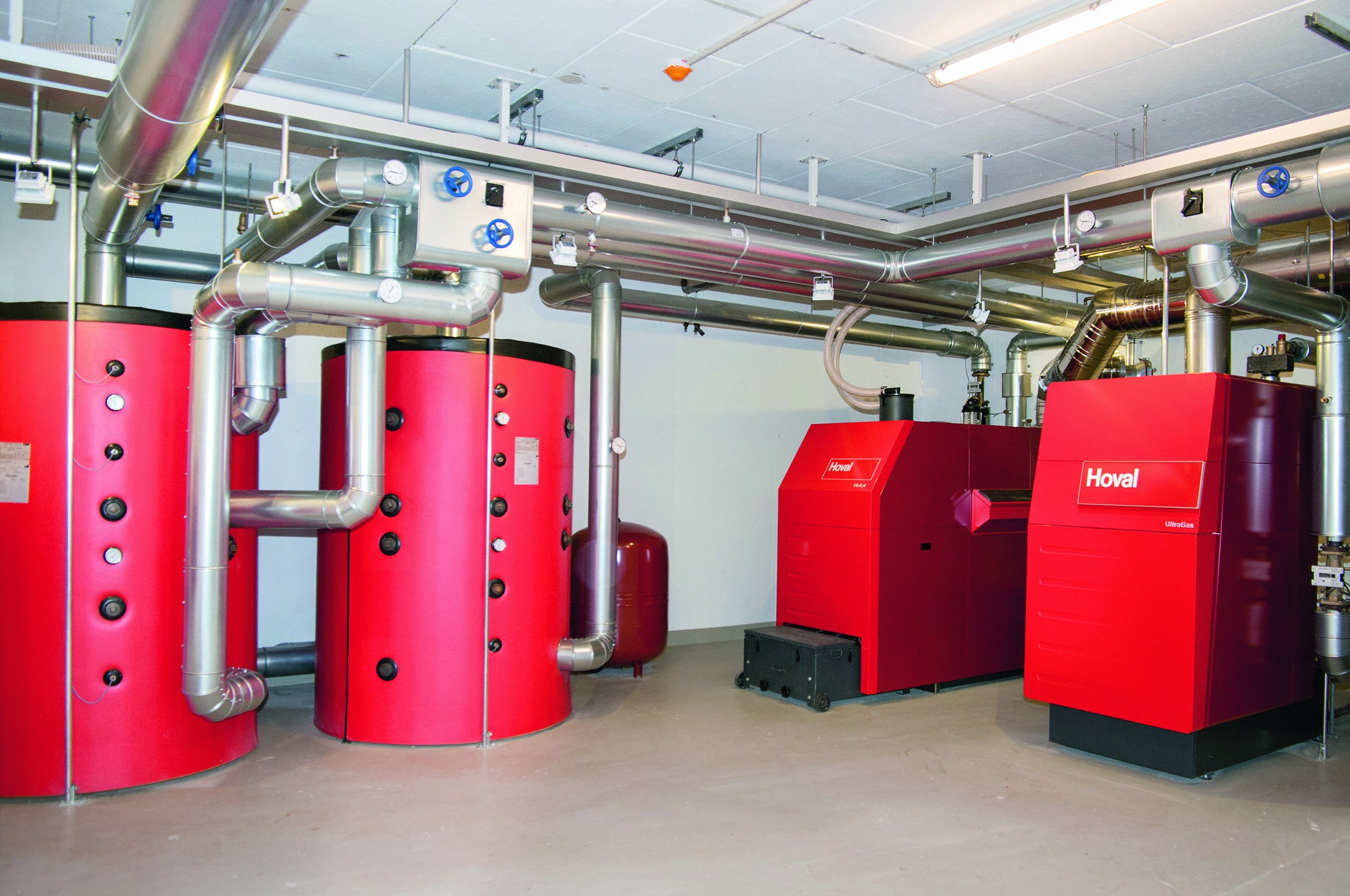 Hybridanlage bestehend aus Holzpellet- und Gaskessel mit zwei Pufferspeichern zur Abfederung schwankender Wärmebedarfe. - Quelle: Bild: Hoval GmbH