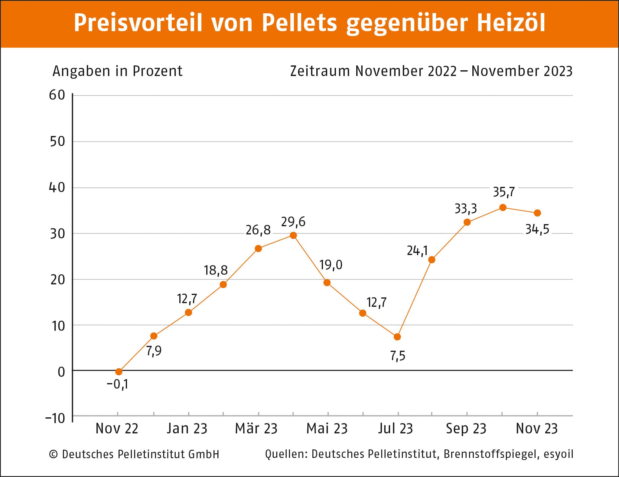 Berlin, 16.11.2023 • Parallel zu den Temperaturen ist auch der Preis für Holzpellets im November erneut gesunken. Wie das Deutsche Pelletinstitut (DEPI) berichtet, kostet eine Tonne (t) der Presslinge derzeit im Durchschnitt 350,85 Euro. Der Preis ist demnach im Vergleich zum Vormonat Oktober um etwa 5,1 Prozent zurückgegangen und der bisher niedrigste Durchschnittspreis des Jahres. Eine Kilowattstunde Wärme aus Pellets ist für 7,02 ct zu haben. Der Preisvorteil entspricht rund 34 Prozent im Vergleich zu Heizöl und rund 29 Prozent gegenüber Erdgas.