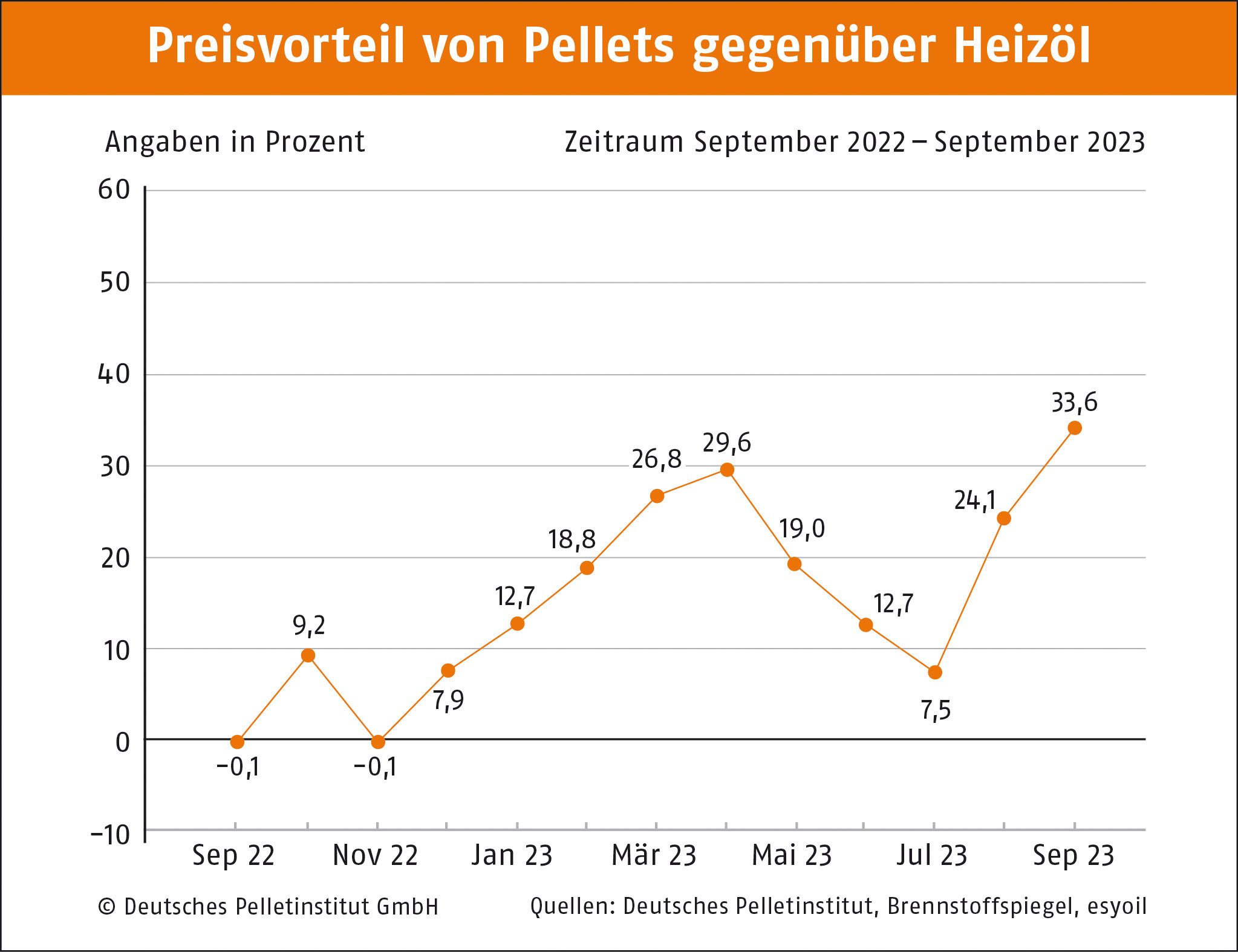 Berlin, 18.09.2023 • Der Preis für Holzpellets ist laut dem Deutschen Pelletinstitut (DEPI) im September im dritten Monat in Folge gesunken. Im Durchschnitt kostet eine Tonne (t) derzeit 382,44 Euro, was einem Rückgang von 5,2 Prozent im Vergleich zum August entspricht. Damit hat sich der Pelletpreis im Vergleich zum Vorjahr halbiert. Zurückzuführen ist die für diese Jahreszeit ungewöhnliche Preiskurve nach unten immer noch auf die Energiekrise im letzten Jahr. Die Kosten für eine Kilowattstunde (kWh) Wärme aus Pellets belaufen sich auf 7,65 Cent, was einen Preisvorteil von 34 Prozent gegenüber Heizöl und etwa 28 Prozent gegenüber Erdgas bedeutet.