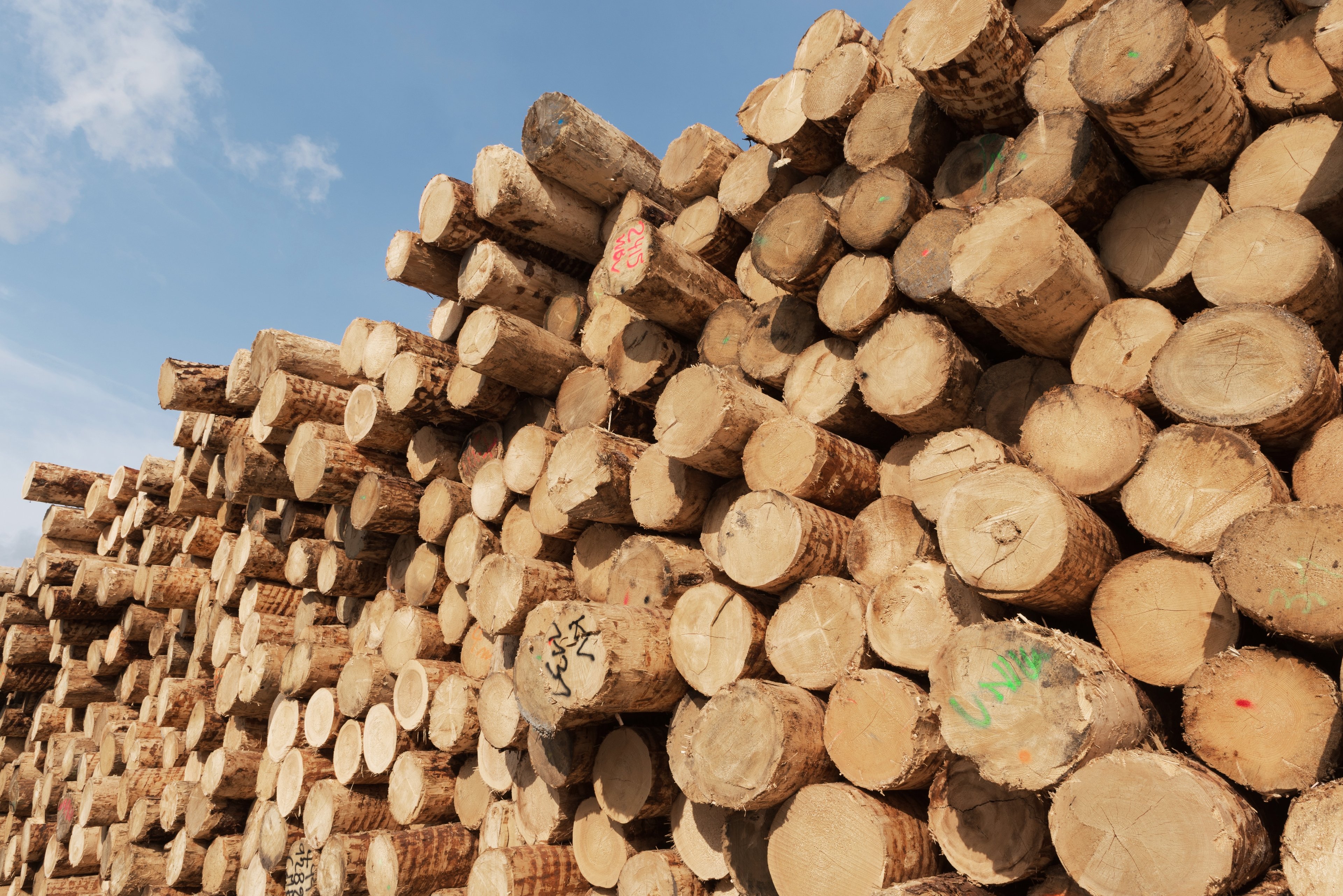 Rundholz-Stapel im Pelletwerk
